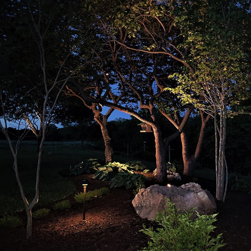 Display your best side at night by accenting the hard work you've put into your trees and plantings.
